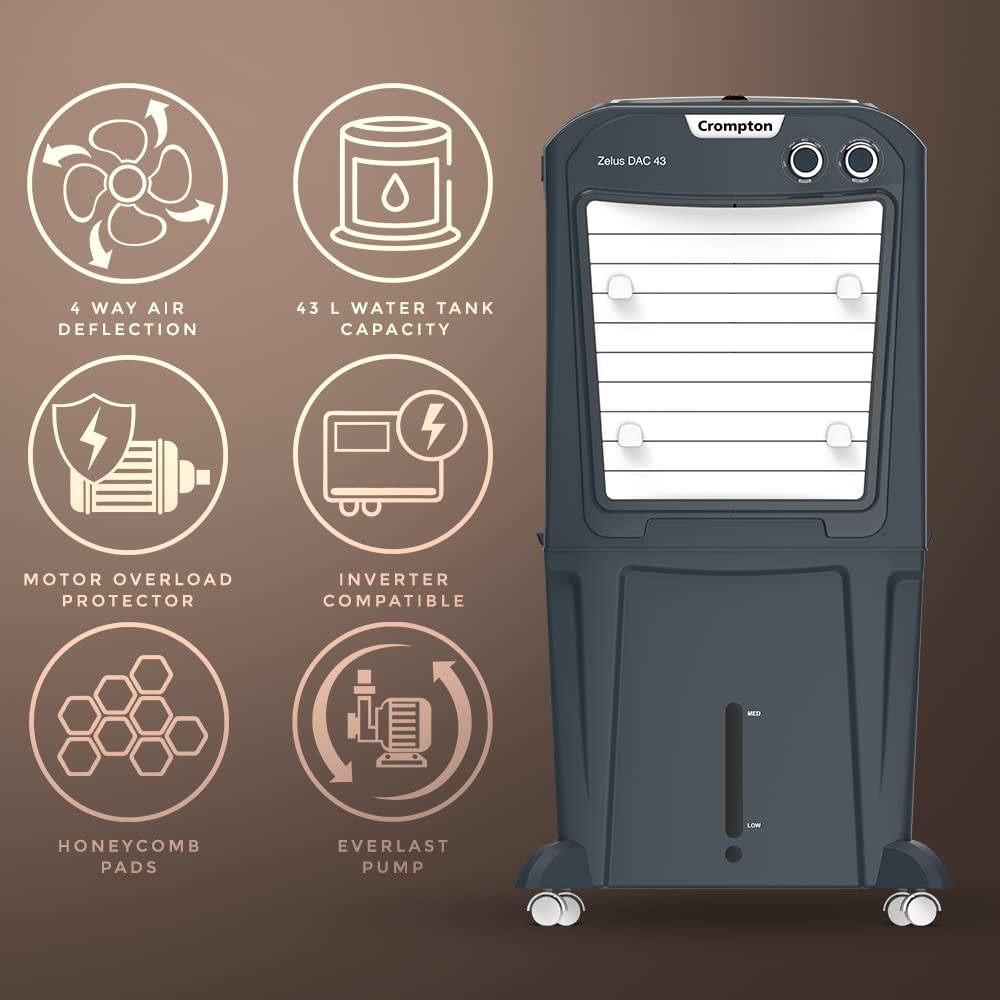 Crompton Zelus DAC43 Air Coolers Zelus coolers are our fresh range of mini desert coolers crafted with cooling comfort for Indian market addressing needs of small and medium rooms. These are provided with 12” fans and honeycomb pads to deliver prolonged cooling. The Everlast Pump is less prone to jamming even with high TDS level of water.