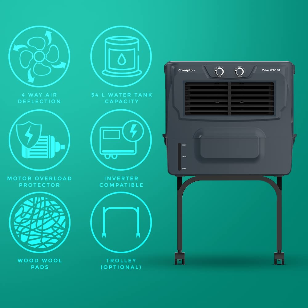 | Everlast pump helps in preventing jamming issues in the cooler even with hard water thus ensuring durability of the pump. | The air cooler is engineered with a motor overload protector that ensures durability & longer motor life while preventing it from overheating. | With 4 way air deflection, adjust the direction of air according to your need which not only keeps the room cool but also gives you a feeling of relaxation. | Zelus WAC 54 comes with inverter compatibility for uninterrupted cooling allowing you to experience cool air even during power cut. |