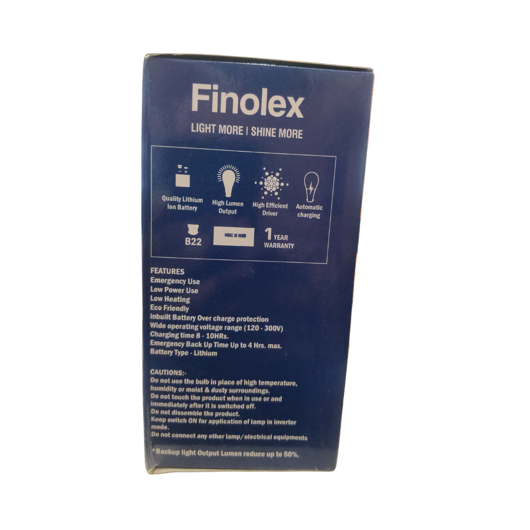 "The Finolex Inverter LED Bulb provides up to 4 hours of backup during power outages. With only 9 watts of power consumption, this LED bulb is not only energy-efficient but also offers extended illumination. Say goodbye to frequent bulb replacements and enjoy uninterrupted lighting with Finolex."