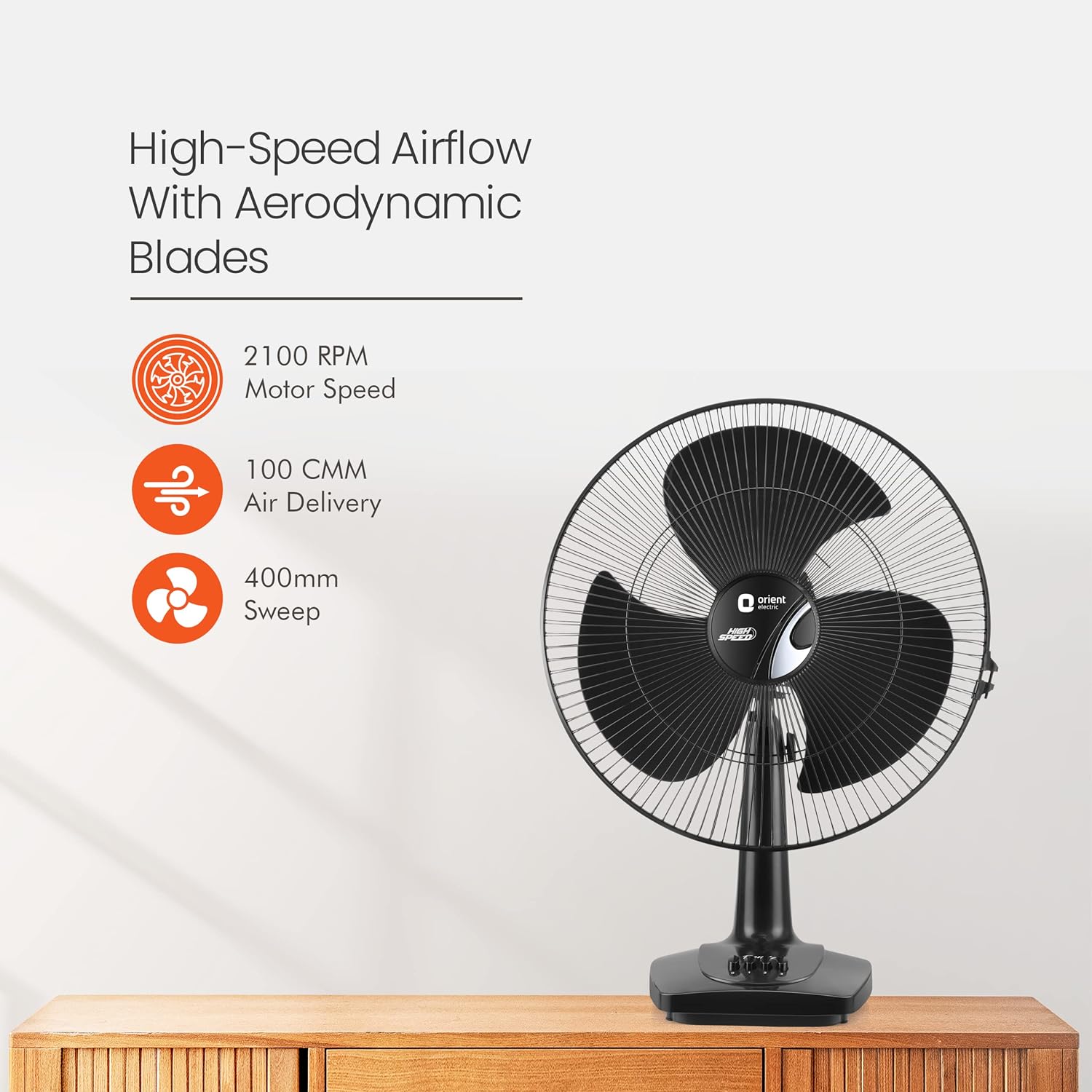 Specially designed powerful motor to deliver extra air thrust. Aerodynamically designed blades for maximum air delivery. Adjustable upward & downward tilt mechanism. 90 degree oscillation. Extra protection against corrosion with powder coated Guard and Polymer ring.